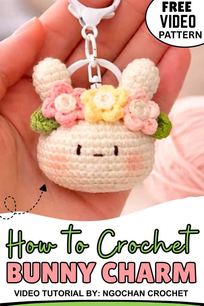 If you want a cute buddy, learn how to crochet this cute bunny face keychain with a flower mane. The garland consists of three basic flowers that can be finished in minutes in three colors.