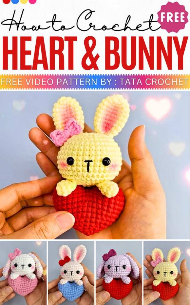 For gifting, crochet this big sitting Bunny plushie holding a heart amigurumi with a red bow made from a rectangle. The tutor demonstrates crocheting ut using two different yarn sizes to show how the same pattern can create both a 15 cm (chenille) and a 9 cm (cotton) version.