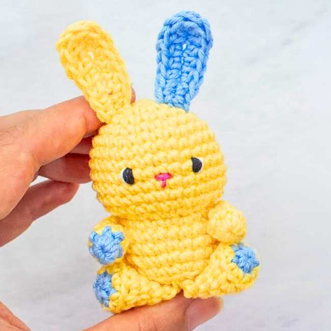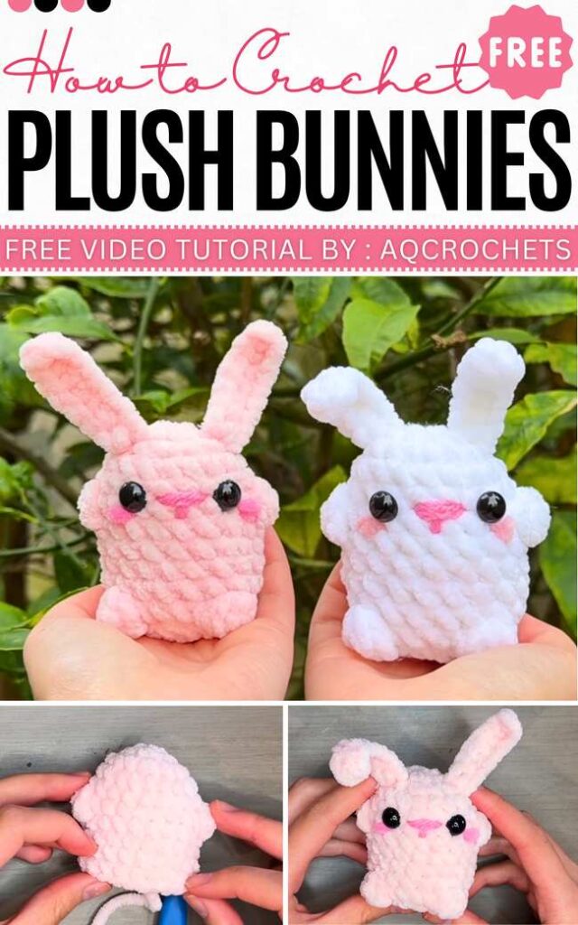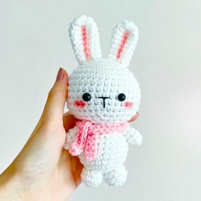 Learn how to crochet a No-Sew Mini Bunny plush with ears either straight up or one bent in half. You can either crochet in white or pink with the same chubby body, big eyes, nose, blush, and no-sew legs and arms.