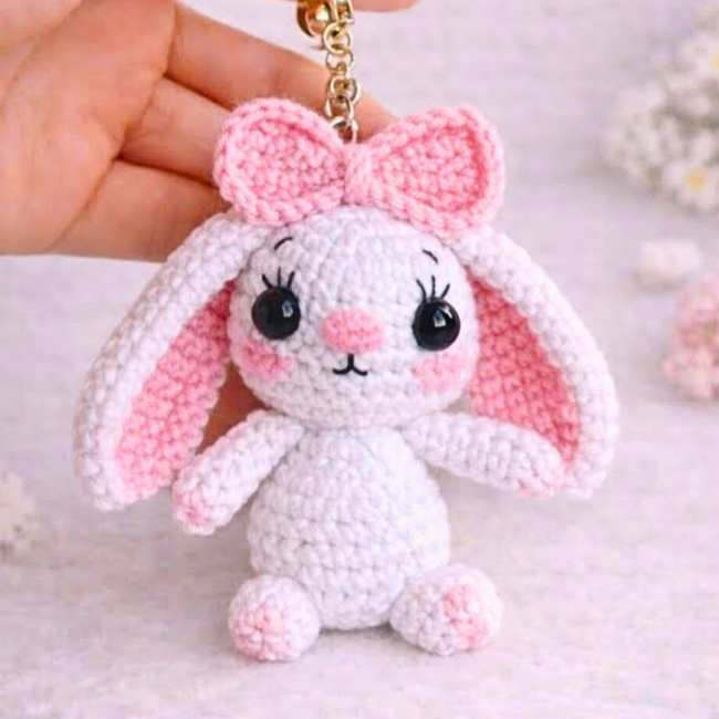 Here is a step-by-step tutorial to crochet a Bunny with a Heart Keychain with an optional bow for a girl version. You can choose from red, pink, yellow, blue, and even aqua for the heart and light shades of these colors including beige for the bunny.