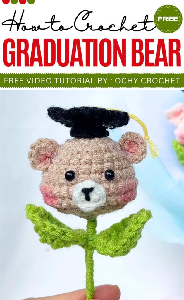 Brighten up a graduation bouquet with these animal-themed flowers. This tutorial shows you how to crochet a small bear head wearing a graduation cap, which is then attached to a wire stem with green leaves. It’s a creative way to combine amigurumi with floral decor.
