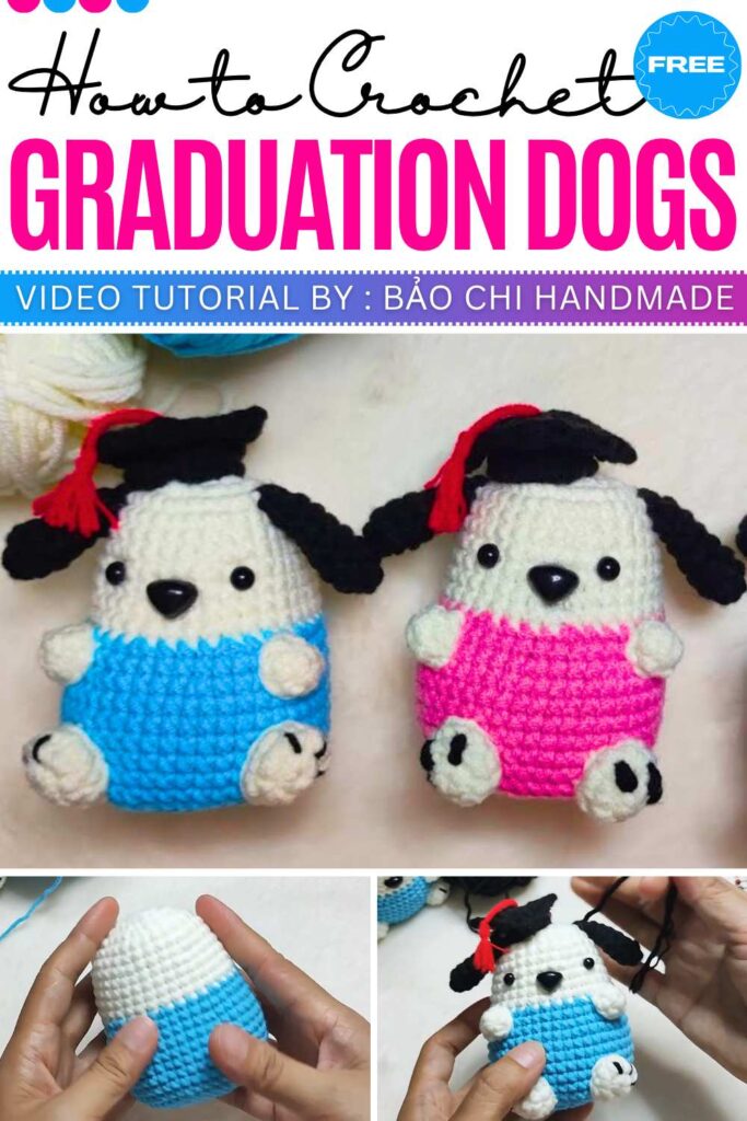 Create an adorable dog in a graduation gown with this detailed tutorial. You will crochet the body and head as one piece, then add a small black graduation cap and a matching gown. The project includes instructions for crafting floppy ears and a tiny red tassel to complete the scholarly look.