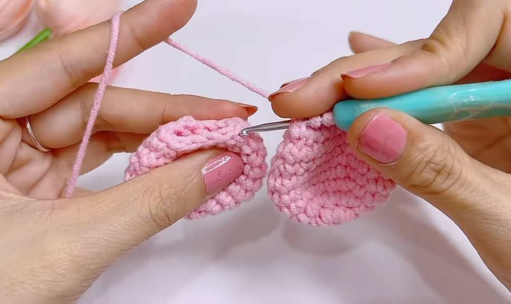 You will crochet the 5 petals together to form the flower. Rnd 1 (Joining Rnd): Join Pink yarn to any st on the first petal. [3 sc, 1 dec] across the 12 sts of the first petal (leaving 1 st unworked). Insert hook into the next petal and continue the [3 sc, 1 dec] pattern across the sts of that petal. Repeat this process for all 5 petals, joining them in a continuous ring. Sl st to the first sc to join.