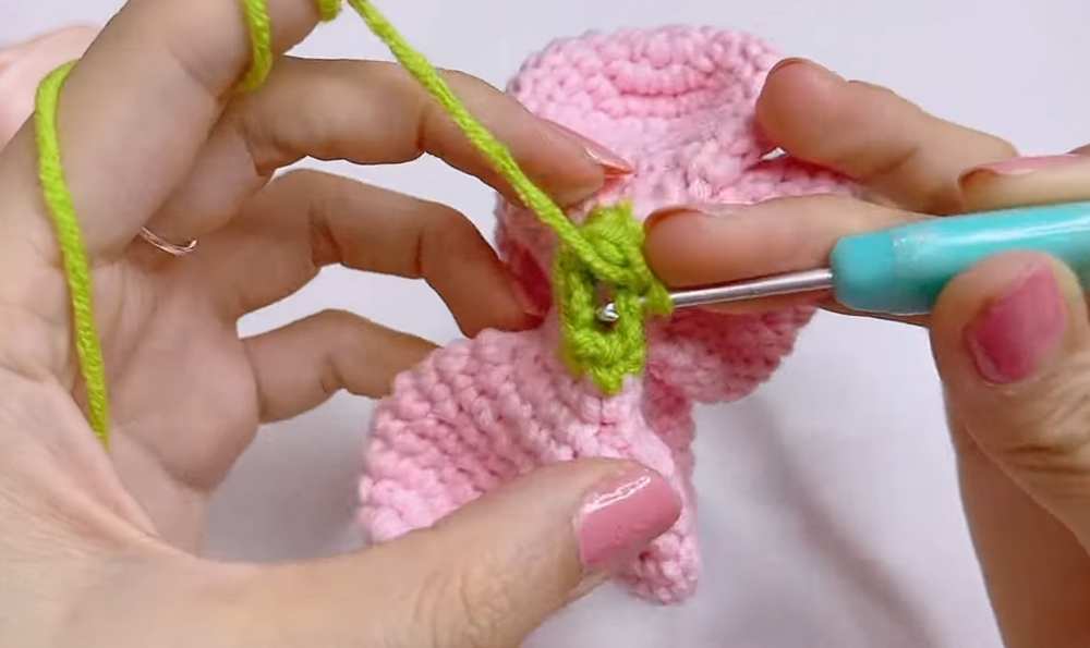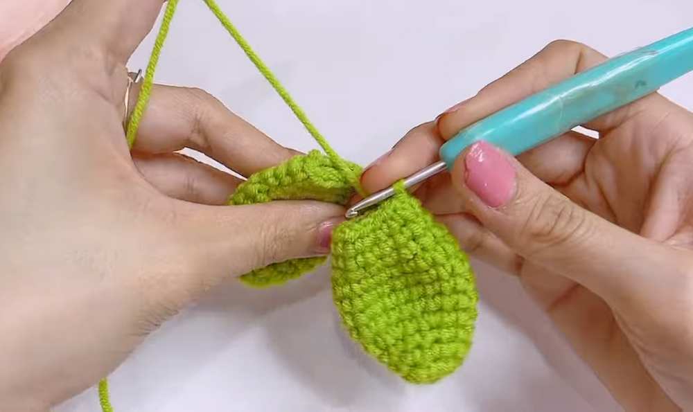 Hold the two leaves together. Joining Rnd 1: Join Green yarn, sc 10 evenly around the base opening of both leaves (stitching them together into one piece with an opening in the center). Join. Joining Rnd 2: sc in each of the 10 sts around. Join. Finish: Fasten off and weave in the end securely.