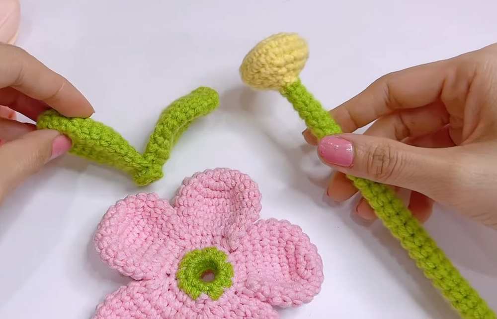 Yarn in Yellow (for flower center), Pink (for petals), and Green (for stem/leaves)