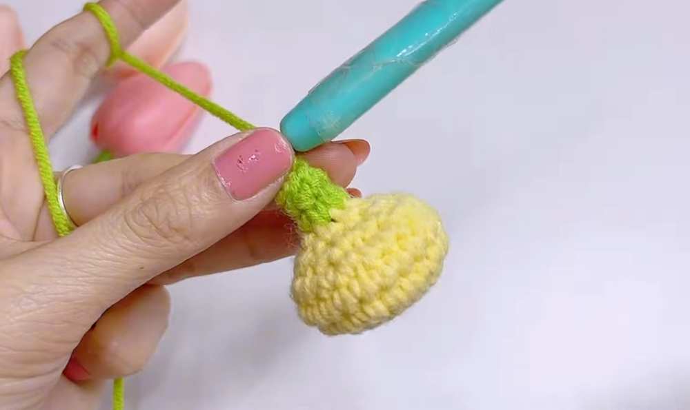 Change to Green yarn. Rnd 1: Ch 1, 6 sc around the remaining 6 sts of the yellow center. Join. (6) Rnd 2 – 40: sc in each st around.