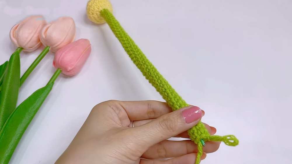 Join. (6 sts per round) Note: Continue working rounds of 6 sc until the stem reaches your desired length (video shows 40 rounds to match a 20cm floral wire).