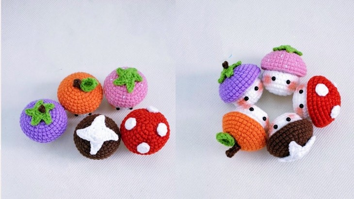 The base pattern for crocheting these tiny fruit toadstools is the same. Then add your favorite fruit details and colors on the cap, from white spots to leaves, seeds, embroidery, and more. The cap can also be pulled upward, making it playable.