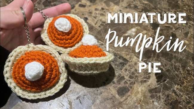 Learn how to crochet a mini pumpkin pie keychain, perfect for fall-themed accessories or garlands. The project is divided into three main parts: the beige crust, the orange pumpkin filling, and a white dollop of whipped cream.