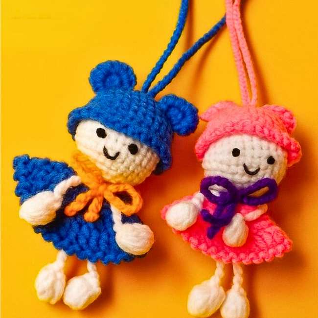 Learn how to crochet an adorable, beginner-friendly amigurumi doll keychain that can be used as a car hanger and stuff like this, like a bag charm or a gift. Uses white yarn (head/limbs), pink yarn (hat/dress), and small amounts of black and blue for details. A 2.5mm hook and cotton stuffing are required.