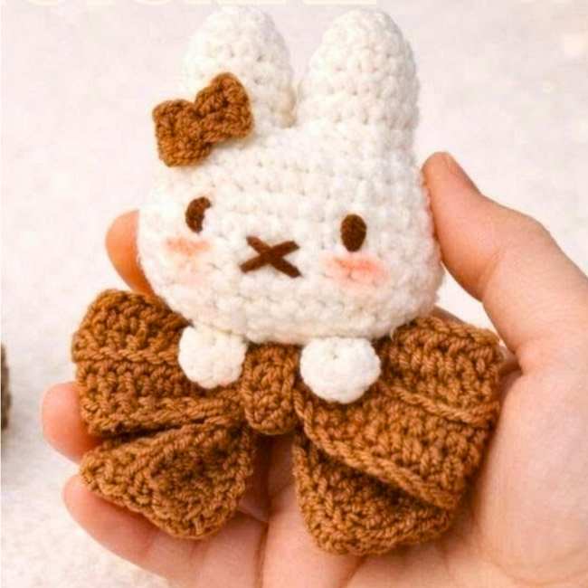Learn how to crochet a Bow Bunny keychain or bag charm. Using a 2.5 mm hook and matching yarn, the process starts with a magic ring to form two individual ears, which are later joined to build the head and body in continuous rounds.