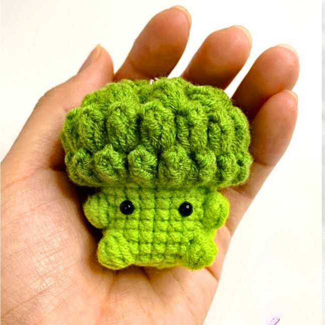 Crocheting the broccoli keychain that looks very similar to the baby mushroom keychain, and can be finished without any sewing. It stands out for its clever use of the “popcorn stitch,” which perfectly mimics the dense, bumpy florets of a real vegetable.