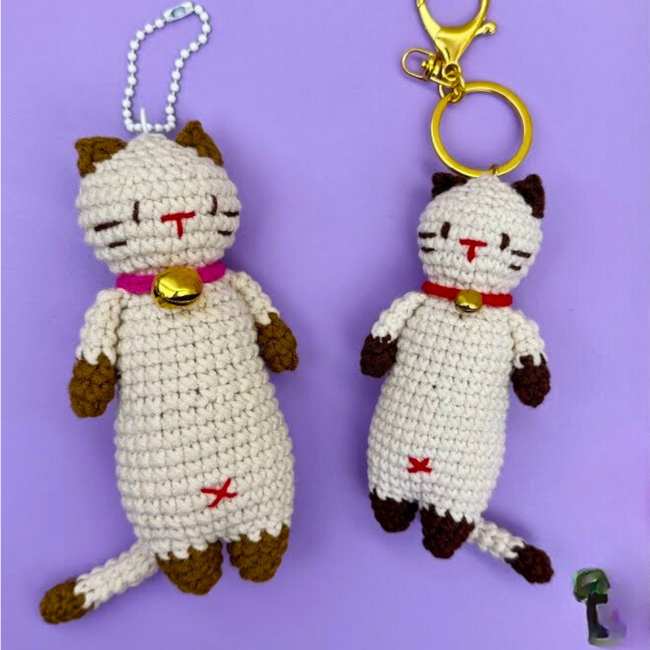 Learn how to crochet an adorable, no-sew amigurumi cat keychain. The “no-sew” design is a highlight, as the limbs and ears are crocheted directly into the body during the crocheting process. The tutorial demonstrates a larger cat using 5-ply yarn and a smaller version using 4-ply yarn.