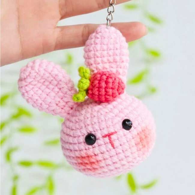 With this tutorial, you can crochet an amigurumi bunny head in pink color with a small carrot accessory on the forehead. The addition of the strawberry or carrot is a clever design choice with unstuffed ears.