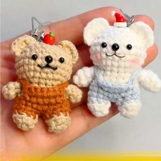 Using the same base round face pattern, you can crochet a set of three bear keychains. This includes the polar bear, panda, and grizzly bear variations taught in the same 12-minute tutorial. The polar bear and the grizzly are no different. Just change the color to brown or white.
