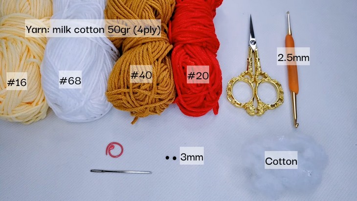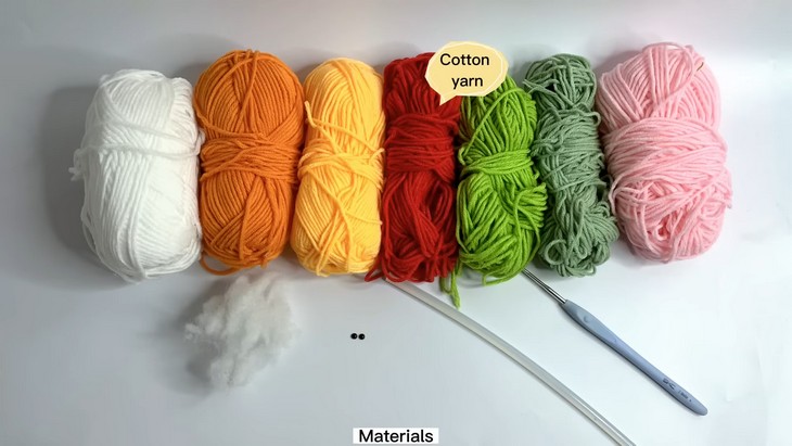 - Cotton yarn in red, orange, green, dull green, orange, white, and pink. You can use the Milk Cotton yarn.