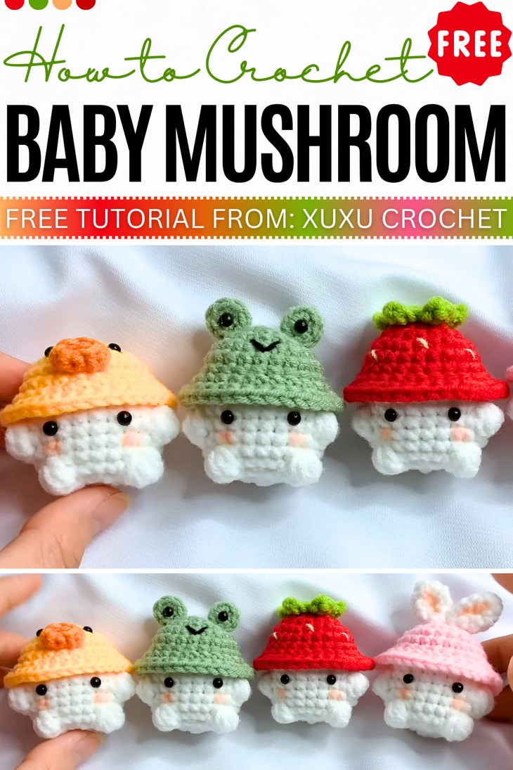With this 4-in-1 tutorial, learn how to crochet a baby mushroom with a strawberry, a frog, a chick, and the bunny hat that just need a bit of color changes, embroidery, and tiny additions. The crochet frog features googly eyes, chick the beak and the safety beads, the strawberry baby mushroom embroidery seeds and sprout, and the bunny version with the realistic bunny ears. You can select your favorite version of these baby mushrooms, whether you are a beginner or an expert.