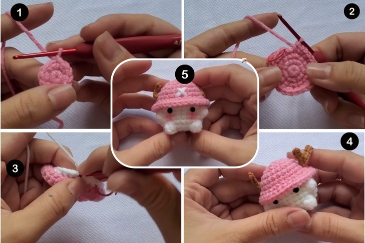 With anime adaptation, One Piece characters gained huge popularity. So, if you have an anime fan in your circle, crochet this Chopper baby mushroom keychain for absolute beginners. Crocheting this mushroom variation has the same hat pattern but in pink and also features antlers and a cross embroidery. So, if you already know how to crochet the baby mushroom, it will be easy. Instead of white, you can also crochet this in light brown for an accurate Chopper look.