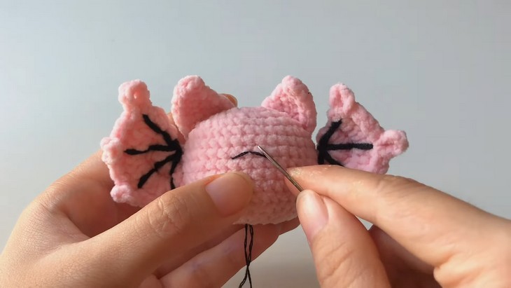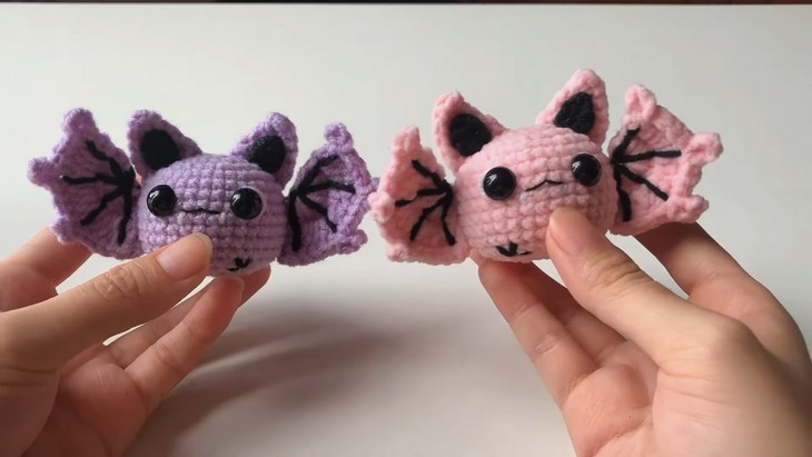 Here is a quick tutorial to crochet the cutest head-and-wings bat plushie designed by Kiwi Crochet for the upcoming Halloween. This plushie is small but features the accurate wings with black sewn veins, the large head and ears with a kawaii face, and tiny legs using embroidery. You can crochet it as a keychain or a hanging amigurumi. This chubby bat can be completed within 45 minutes thanks to bulky yarn. You can also choose from two colors: pink and purple, with the same pattern. You will especially adore its large eyes and layered ears.