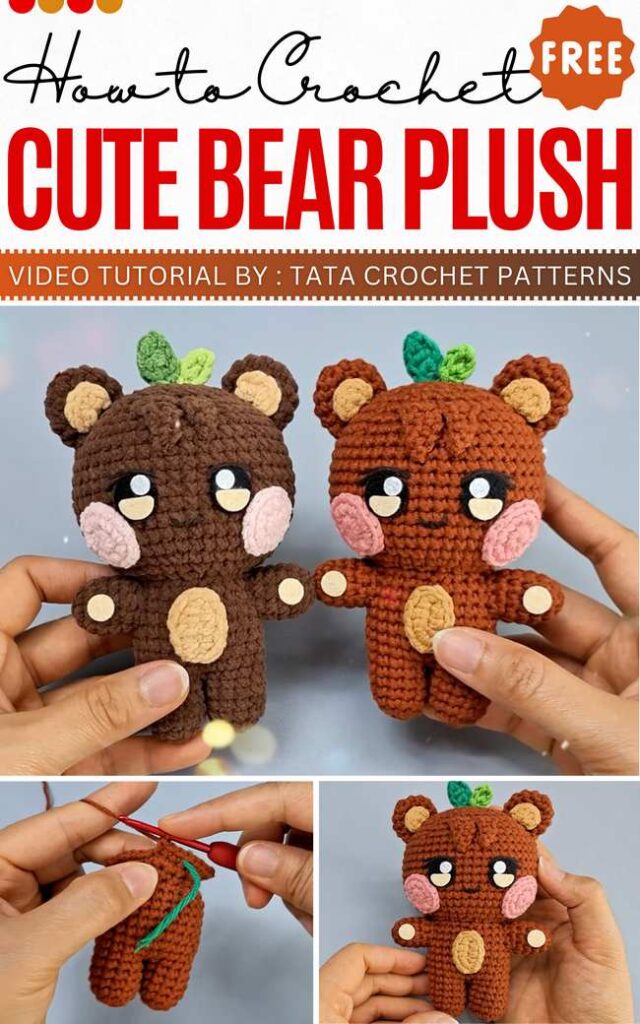 Here is another tutorial to crochet a baby teddy bear plushie with innocent, large eyes. The tutor has posed this plush bear sitting and also crocheted a small scarf in green. I am especially in love with the detail of the eyes of this, with the white part, eyelashes, and eyebrows, too.
