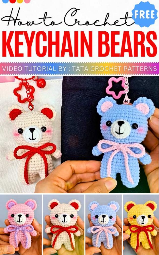 Here is a tutorial to crochet a miniature bear amigurumi with a chain stitch bow. You can choose from pink, pastel purple, yellow, and beige color variations. These are small bear dolls worked in multiple parts, but the legs are joined without sewing.