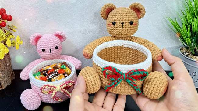 Follow this subtitled tutorial to crochet this unique holiday candy basket for Christmas, Halloween, and birthdays. This big bear basket features 3D amigurumi bear parts that appear to be holding the basket. So, it’s perfect for filling the free candies for the kids.