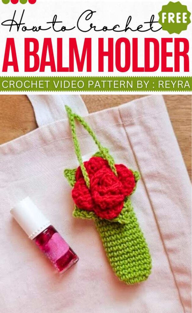 Crochet a rose lip balm holder, which can also be used as a bag charm or bookmark. The holder can be opened by sliding the dark red rose through the hanging loops. This method is very useful to learn for any type of crochet lip balm holders and even a key holder.