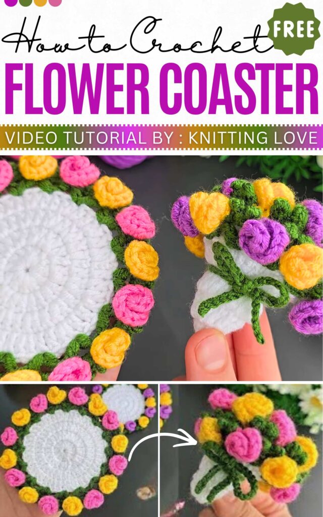 Follow this tutorial to crochet a miniature coaster and flower bouquet from a popular 2-in-1 pattern. You will crochet the roses with alternating yellow and pink yarn. This crochet coaster will be a must-have for every table.