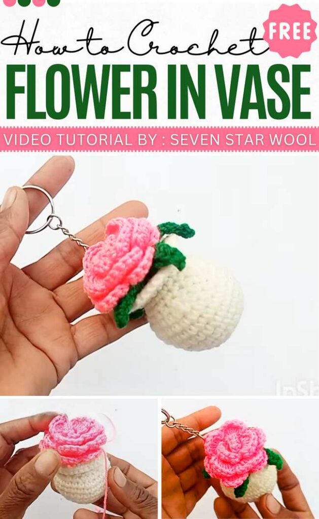 Here is how to crochet a mini rose flower pot keychain, featuring a small vase, a flower, and a leaf base. This small keychain is quite detailed thanks to the use of three-ply yarn with a 3.0 mm crochet hook.