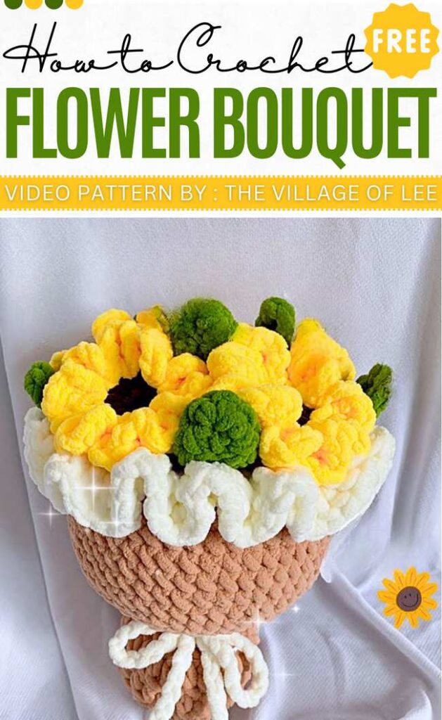 Learn how to make a large Sunflower Bouquet using chunky (6mm) chenille yarn. The finished bouquet measures approximately 53 cm in diameter and 30 cm in length. It is perfect for gifting at weddings to a couple.