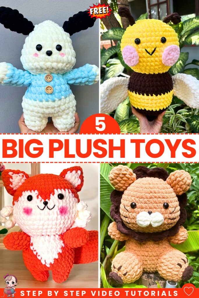 You can imagine how cute the plush and big versions of the 5 popular animal amigurumi will look. In this post, you can learn how to crochet these plushies with 5 crochet big animal plushie tutorials. This small list includes the fox, bee, lion, and two more.