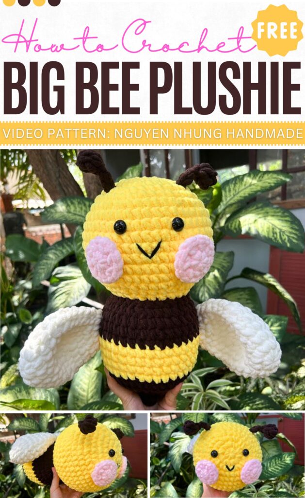 This big bee plushie looks so cute with the crocheted blush. The pattern is of the trendy bumblebee plushie with the bulkiest yarn. You can crochet a standing or lying version of a bee plushie.