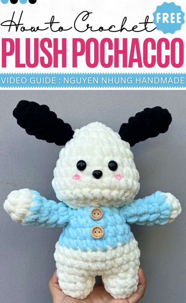 Learn how to crochet a big Pochacco doll with a blue sweater that we shall crochet as you go. It will also have “Handmade” buttons and will be crocheted in a standing pose with hugging arms.
