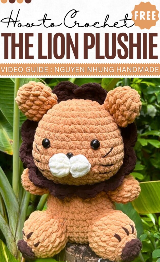 This is undoubtedly the cutest lion plushie on the internet, with a finished size of 30cm. It will be a sitting lion with the puff stitch muzzle in white. You will work the mane with the basic shell stitches in brown all around. Sew the embroidery with brown yarn on the legs and also extend it with the same yarn.