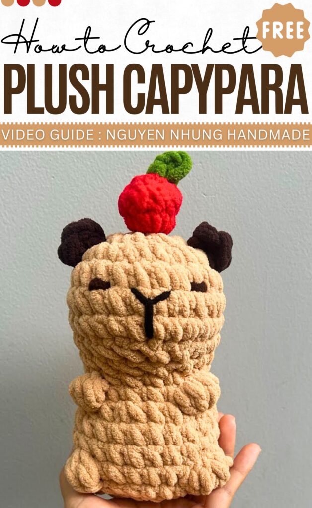 Follow this tutorial to crochet a lovely variation of a no-sew sleeping capybara. This will be a big capybara plushie with a plush cherry on the top. You will be using the puff stitch arms and legs, so sewing is a lot less.