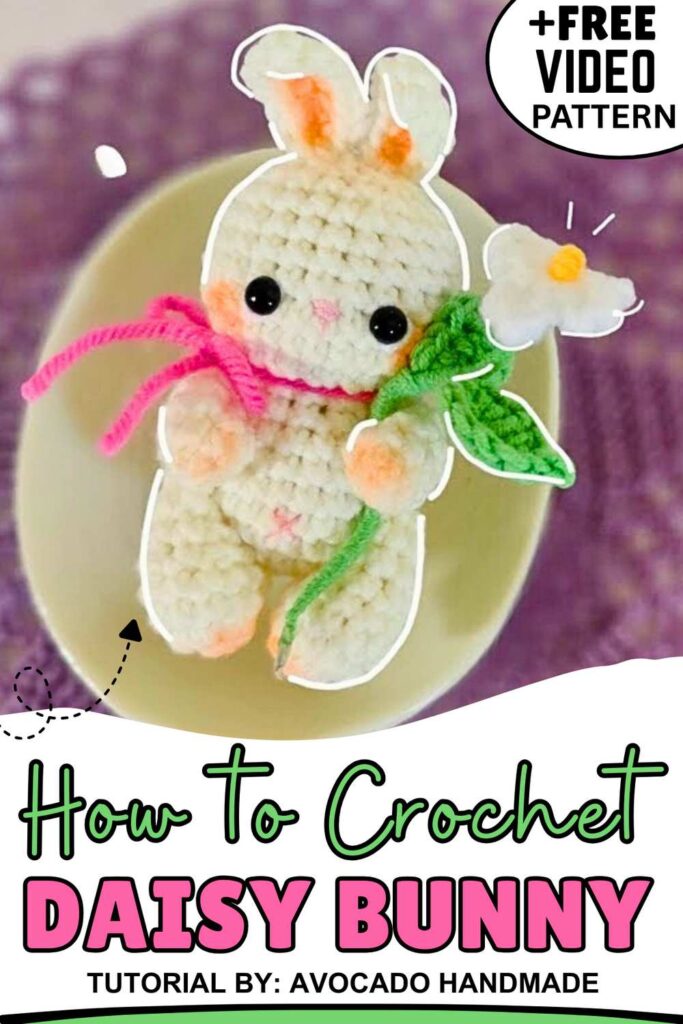 Spring is also around the corner. So, why not crochet this sitting bunny amigurumi holding a daisy flower as an anniversary gift? This will be a miniature low-sew bunny amigurumi, which makes it quick and easy.