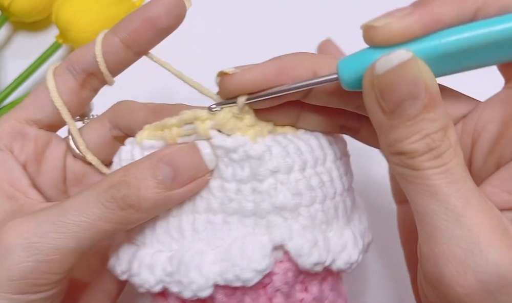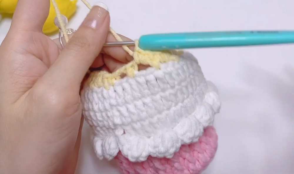 - R1: Join yellow yarn. (ch 2, skip 2, 1 sc) around to create drawstring loops.