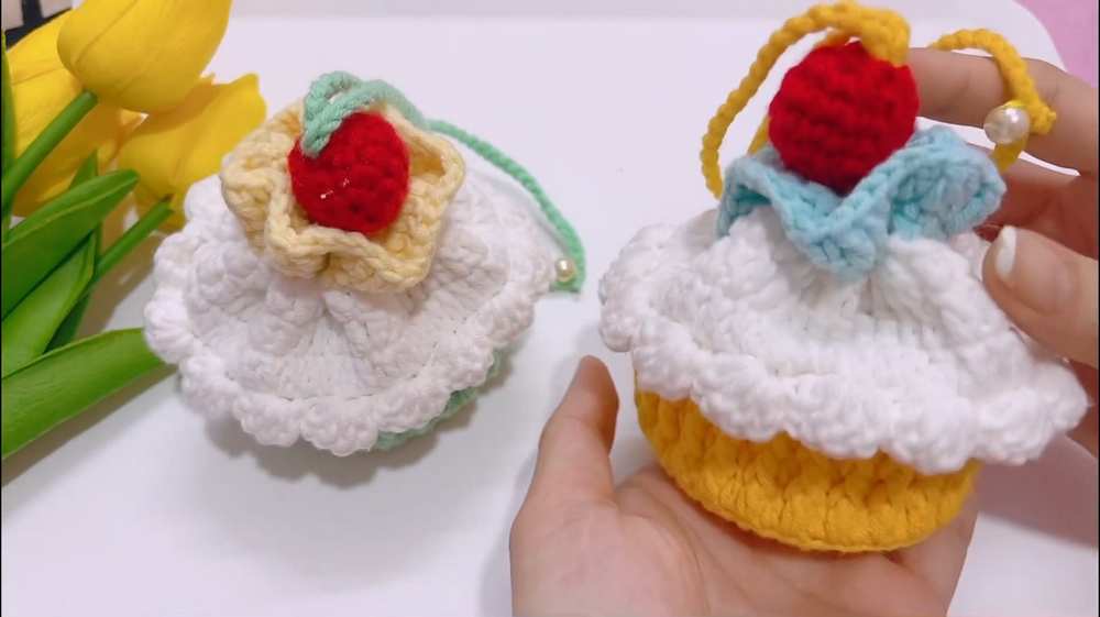 This pattern is for a mini Ice Cream Cake pouch/drawstring bag. It features a decorative “cake” base, a “cream” middle part, and a drawstring top with a cherry charm.