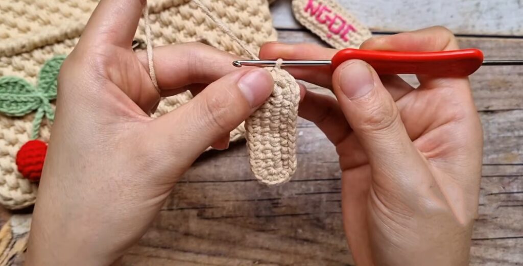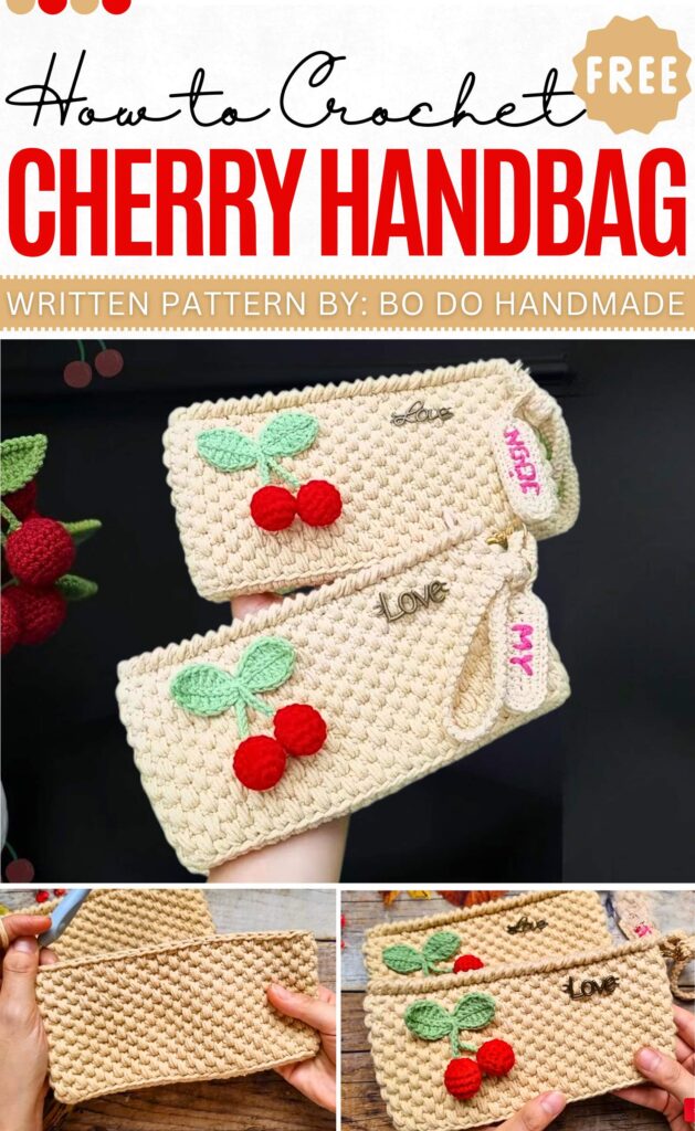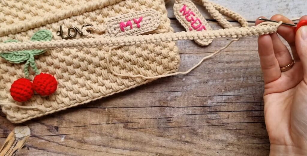 Finish the bag: Crochet a small strap, a name tag, and a cherry to sew on the front.
