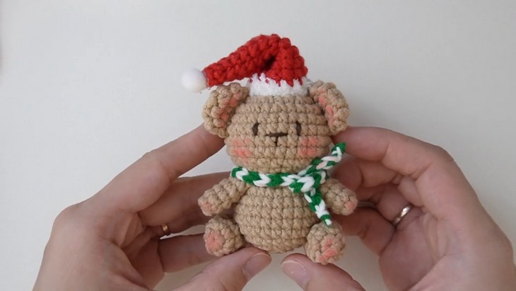 Finding a last-minute amigurumi idea for Christmas gifting with a stitch-by-stitch tutorial? Learn how to crochet this 30-minute mini Christmas bear keychain that wears tiny Christmas accessories: a slouchy Santa hat with a pom pom and a colorful striped scarf. You can crochet this sitting bear amigurumi in two versions, including a light brown or a shade of golden brown, plus accessories in green or red. You can crochet this Christmas amigurumi as a dining table buddy, Christmas ornament, or simply as a bag charm. With a basic low-sew pattern, you can crochet it and improve your skills.