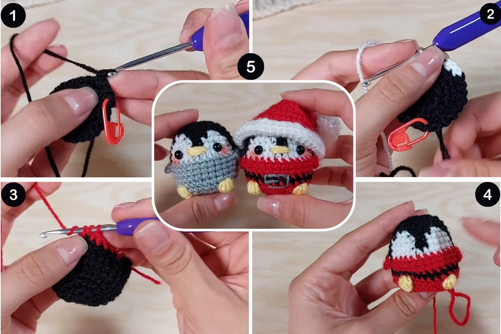 Quick Summary & Skill Level: Crochet a 5 cm penguin body, starting with the head, with increases and immediate color changes within each row by holding two yarn strands. The body color is then joined and crocheted in the new color (e.g., red for the Santa version).