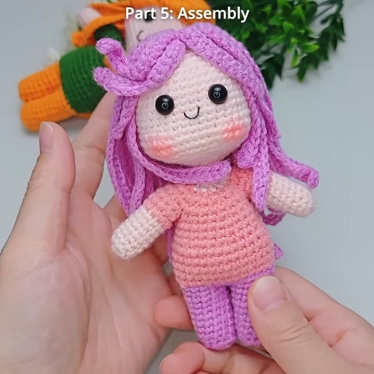 Skill Level: Beginner – Intermediate. The tutor uses many basic and a bit advanced crochet techniques to crochet the cartoon doll. The main stitch is the single crochet, which is used throughout the project. She also uses single crochet increases and decreases to crochet the doll’s body, head, and limbs. Other techniques include the magic ring to start each part, the slip stitch to join rounds, color changes, and working in the inner half stitch for specific parts. The hair is created using half double crochet and chain stitches.
