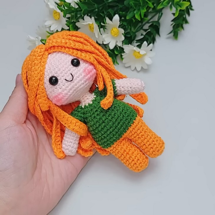 Personalization Tips: While the video does not provide specific personalization tips, you can easily customize the doll by using different colors for the hair, clothes, and skin tone. Also, the tutor shows two versions: orange for hair and green for outfit, dark pink for hair and pink for dress.