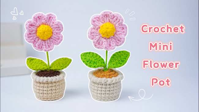 Follow this tutorial to crochet a mini daisy flower pot amigurumi for window decoration. It starts with a bright yellow stamen, a green sepal, and petals that are joined together using simple single and double crochet stitches. You will also learn to crochet leaves by crocheting around thin wire for flexibility.