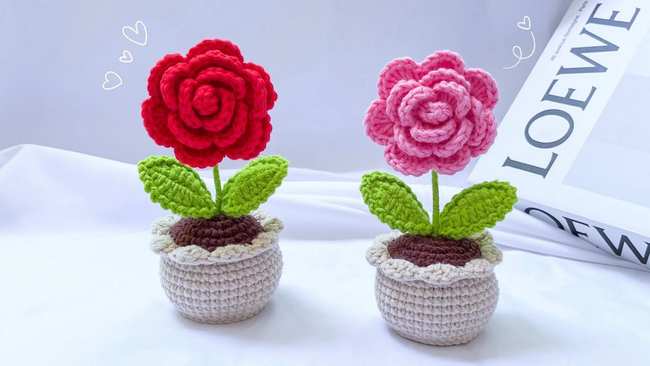 Learn how to crochet a beautiful rose pot, making it an ideal project for beginners. The process starts with crafting the rose petals by creating a long chain, followed by V-stitches to form a base, which is then rolled and glued into a floral shape.