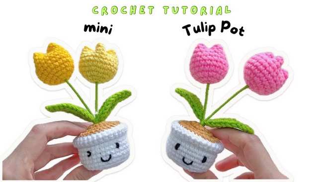 Crochet an amigurumi mini tulip pot, perfect for advanced beginners. The project is divided into five parts: crocheting the pot, the soil, the tulip bud, the leaf, and final assembly. The pot and soil are made using joined rounds and a 3mm hook, while the bud and leaf use a 2mm hook for a finer finish.
