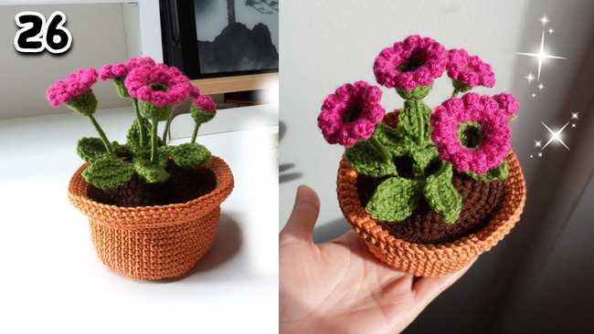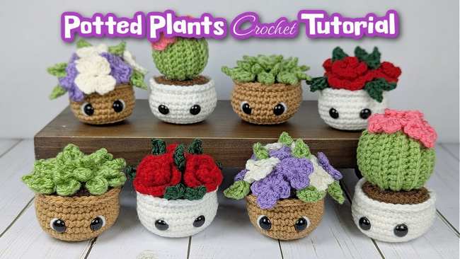 Here is how to crochet amigurumi potted plants, including succulents, roses, lilacs, and cacti. Using a 3.5 mm hook and colorful yarn, the project starts with a base pot pattern built, featuring a textured base and safety eyes for a cute face. The “topsoil” is then crocheted and sewn onto the pot.
