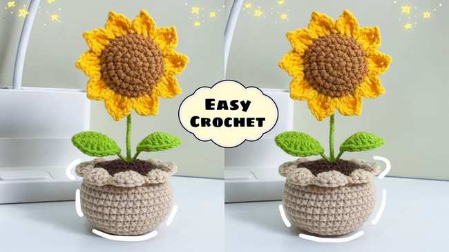 Here is how to crochet a charming crochet sunflower pot. The sunflower head, where a green sepal and brown stamen are joined. After stuffing the flower, the tutorial transitions to making wire-reinforced leaves for a realistic look.