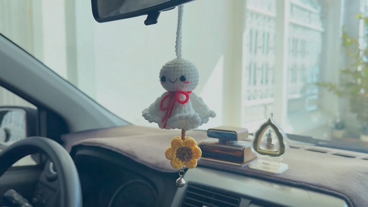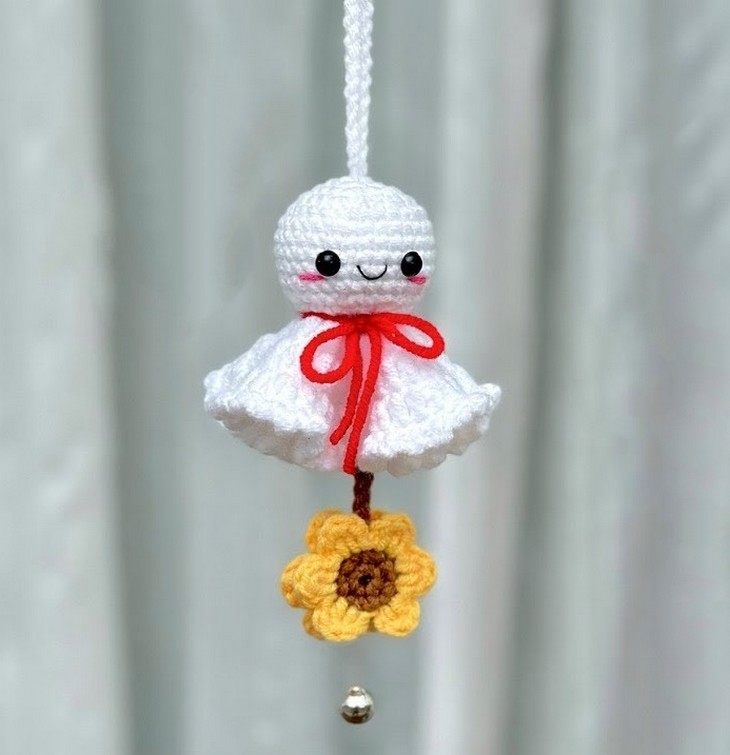 If you are looking for an easy and simple alternative to a crochet Boo ghost, why not try the weather doll? It is so-cute and quick home decor and car hanger project, and here is a design. Learn how to crochet this hanging sunflower and no-sew Japanese good weather doll with a stitch-by-stitch tutorial from Kiwy Crochet. It is perfect for trying something non-traditional at Halloween or any time of the year. It features the same hanging rope, a red necktie, and is finished with a flower applique at the bottom and a bead. It can be completed within just 30 minutes thanks to the basic ghost pattern.