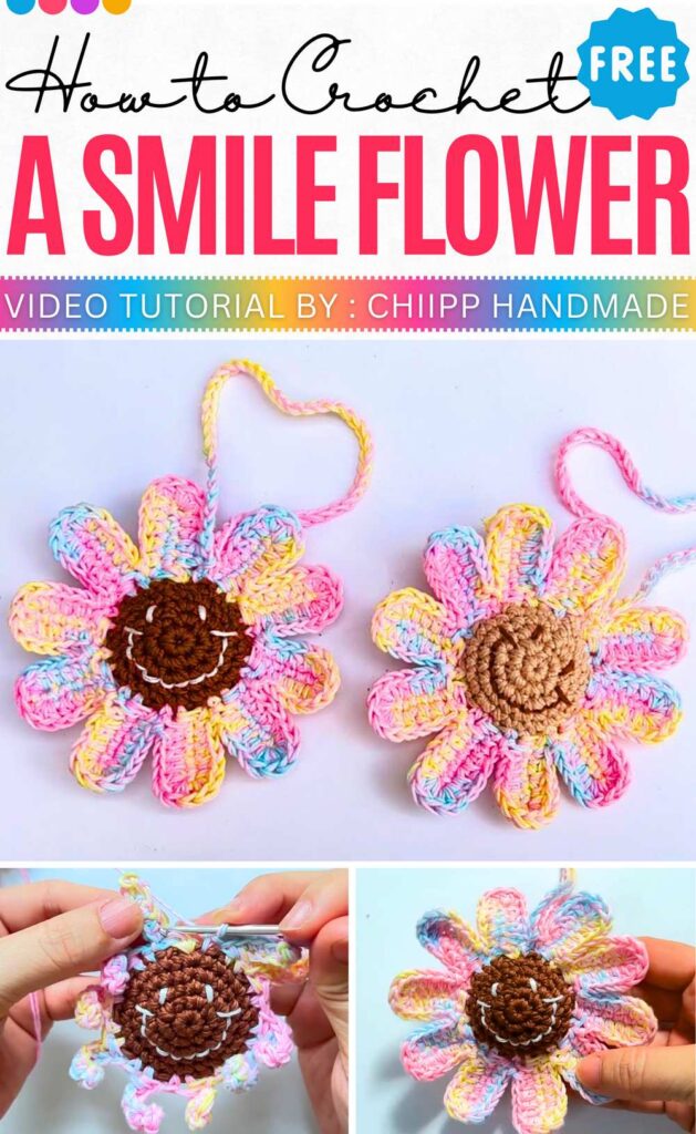 For kids, learn how to crochet a unique smile sunflower keychain or bag charm with lovely pastel-colored petals. Using cotton yarn and a 2.5mm hook, you can crochet a two-sided floral accessory complete with an embroidered happy face.